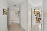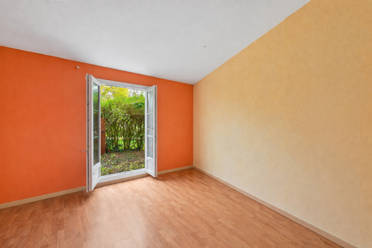 Une entrée ouvrant sur un grand séjour lumineux avec deux grandes portes-fenêtres donnant accès à un spacieux jardin